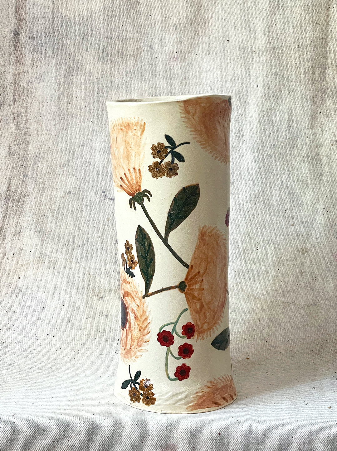 An all-over mixed floral pattern in dusty rose, burgundy and ochre colors on a cylindrical stoneware vase.
