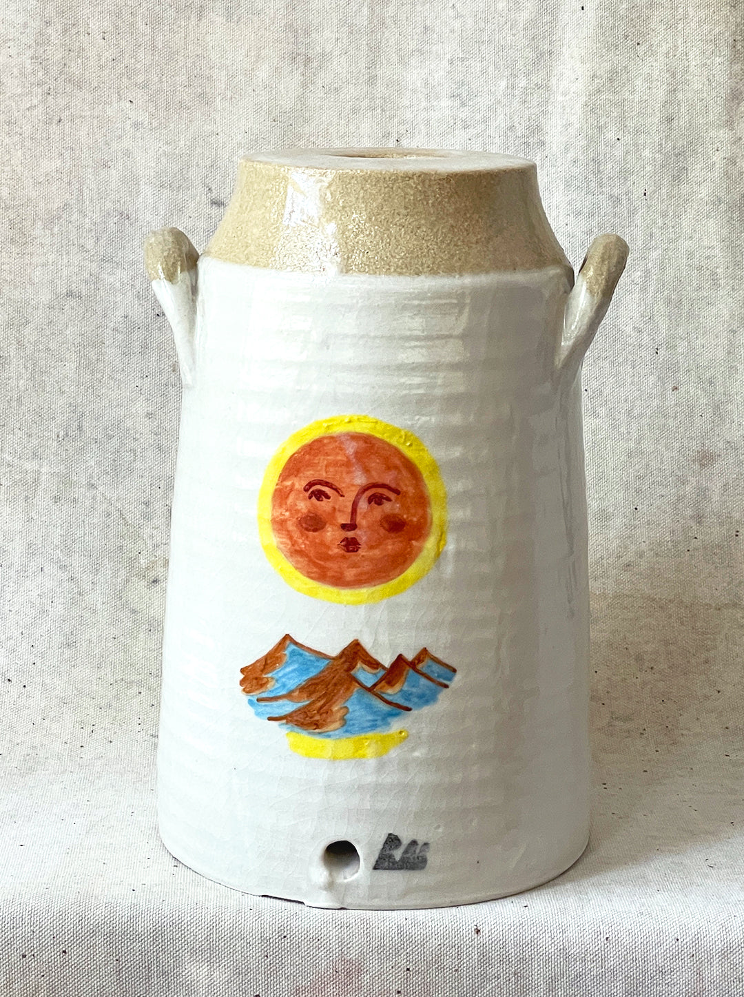 A stoneware lamp base fastened with handles and painted with porcelain slip. Featuring two "vintage" RM motifs, the nopal and the sun over mountain peaks.