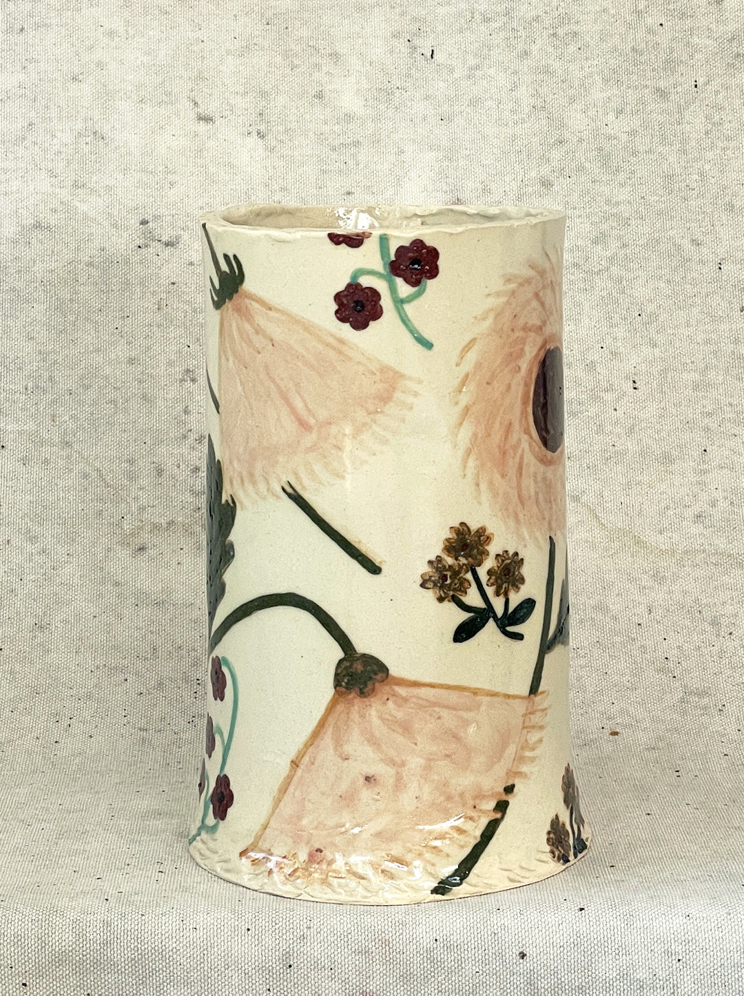 A faded pink mixed floral pattern on a cylindrical stoneware vase.