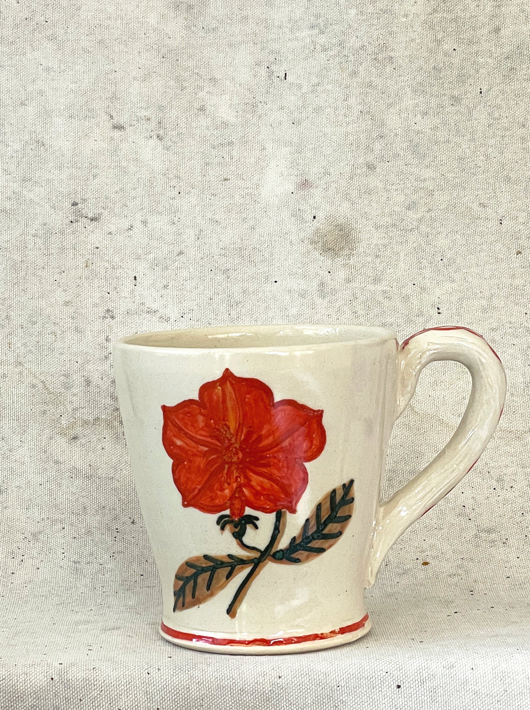 A red petunia on both sides of a stoneware tapered mug with a slight flare at the base. Red braided pattern on the handle.