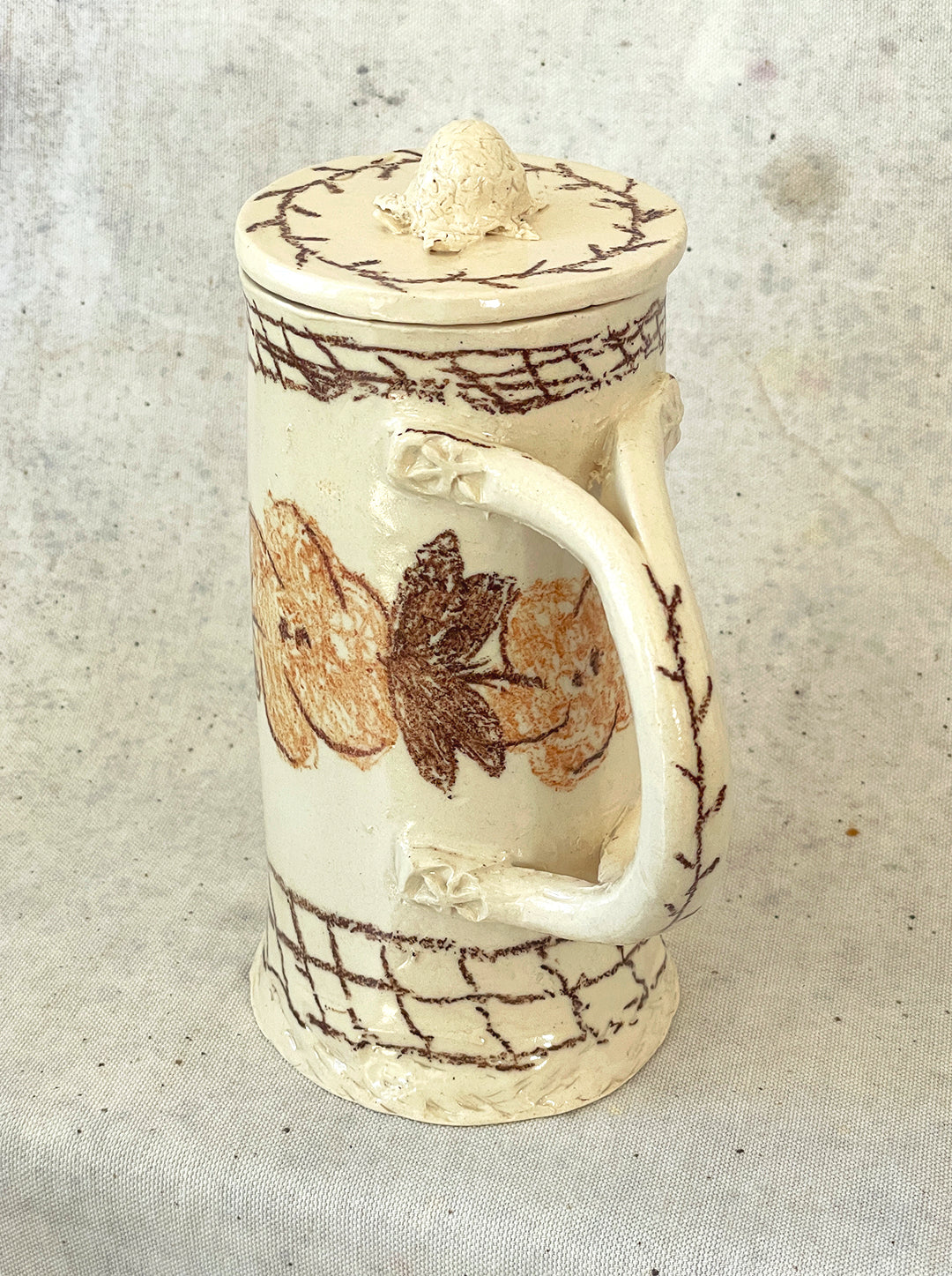 A "functional" stoneware teapot with a brown floral pattern drawn on both sides. To pour it must be done very slowly (small spout) while holding the raspberry top (made by Inez). Split handle embossed with eucalyptus pods and a twig motif to match the lid. May also be used as a pitcher or vase.